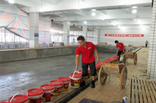 裝修施工前須對泳池蓄水48小時試驗,灌水后池壁外表面不得出現陰濕,每晝夜水量損耗小于每方2升,以檢驗砼的抗滲效果,確不滲漏,才進行裝修施工,否則需采取措施,直至不滲水為止,再進入裝修。